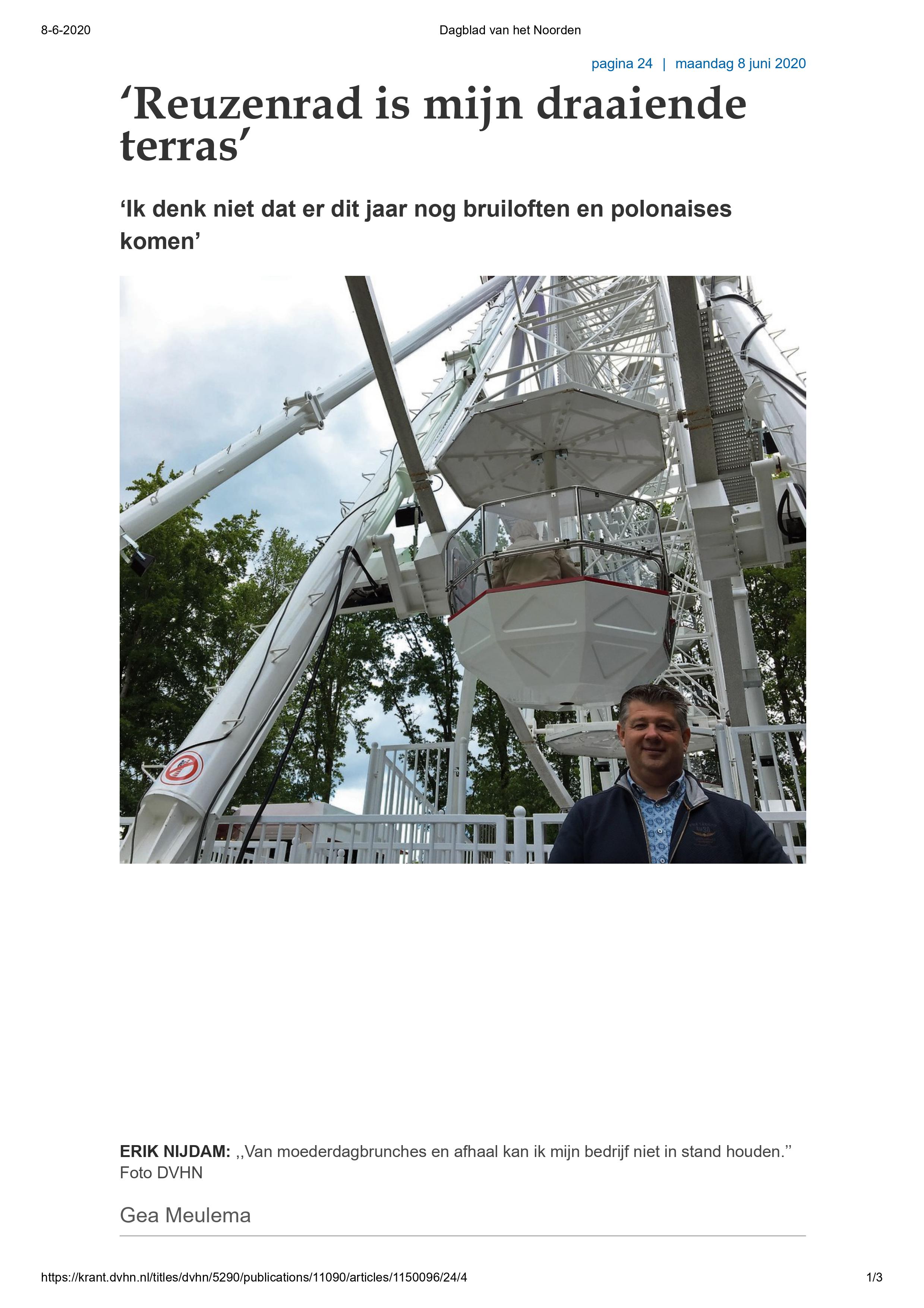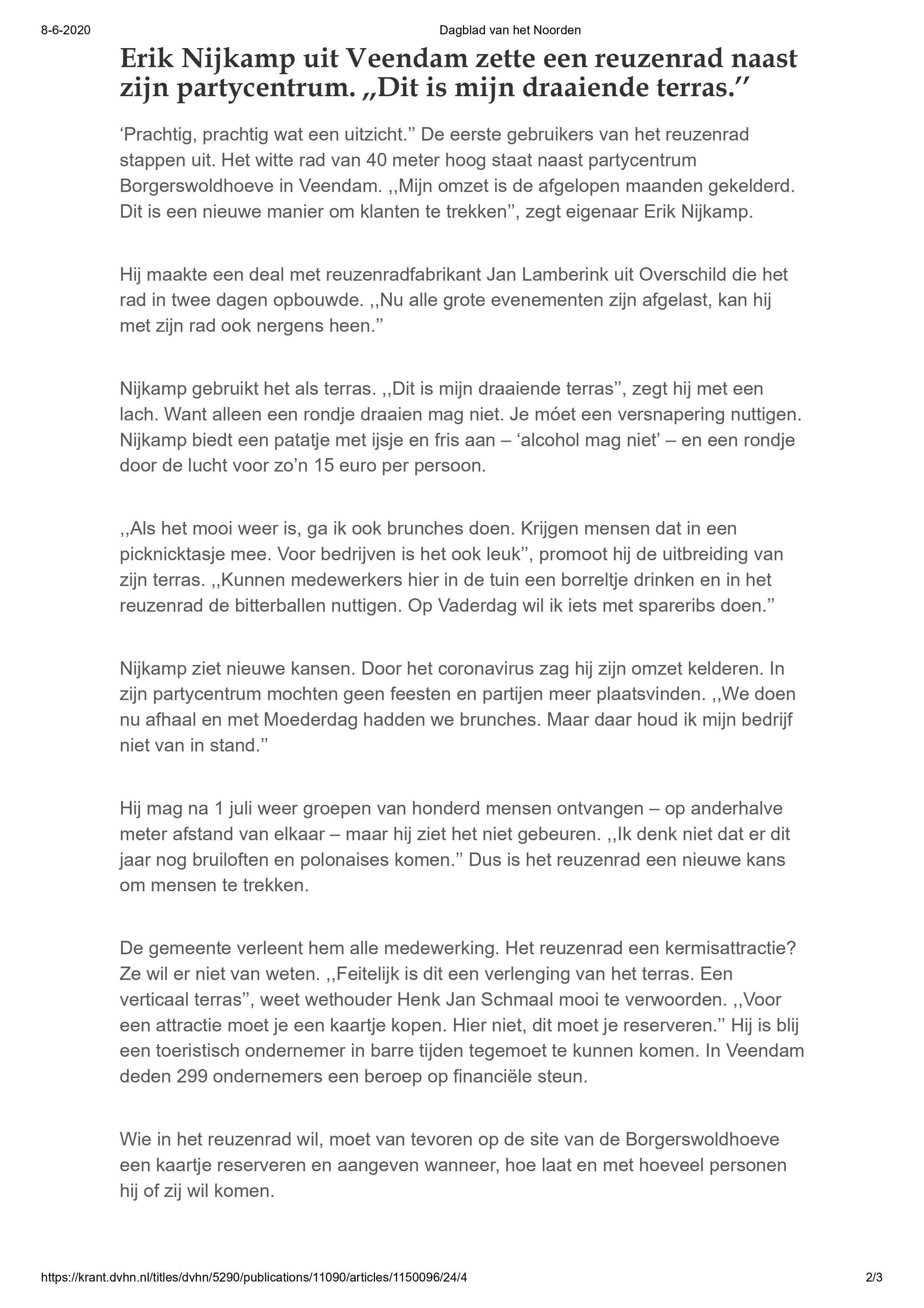 Het zou zo wel eens een zomerattractie van jewelste kunnen worden in Veendam. Erik Nijkamp van party- en recreatiecentrum Borgerswoldhoeve biedt vanaf zaterdag 6 juni gezinnen de mogelijkheid om vanuit een van de 24 bakjes van een 32 meter hoog reuzenrad, het draaiend terras, een snackarrangement te verorberen.